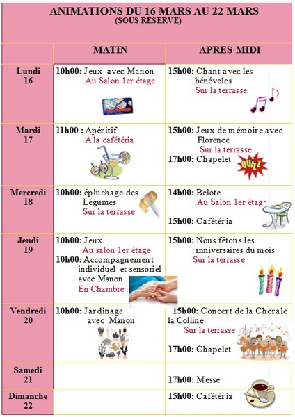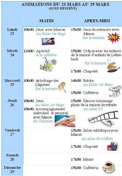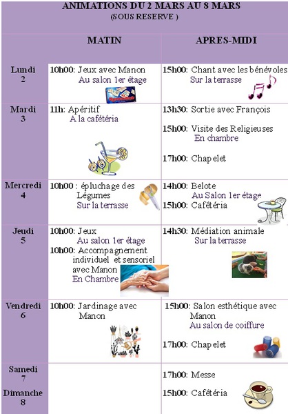 Chaque jour de la semaine des animations sont proposés à nos résidents matins et après-midi :