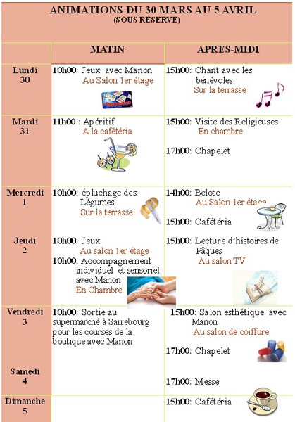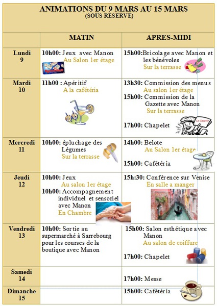 Planning d'animations par semaine du 2 Mars 2020 au 5 avril 2020